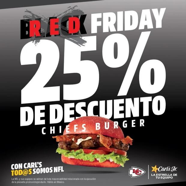 A través de sus canales digitales, la cadena americana de hamburguesas, Carl’s Jr. dio a conocer que durante este viernes 29 de noviembre. Sus clientes podrán disfrutar de una promoción especial, la cual lleva el nombre de Red Friday.