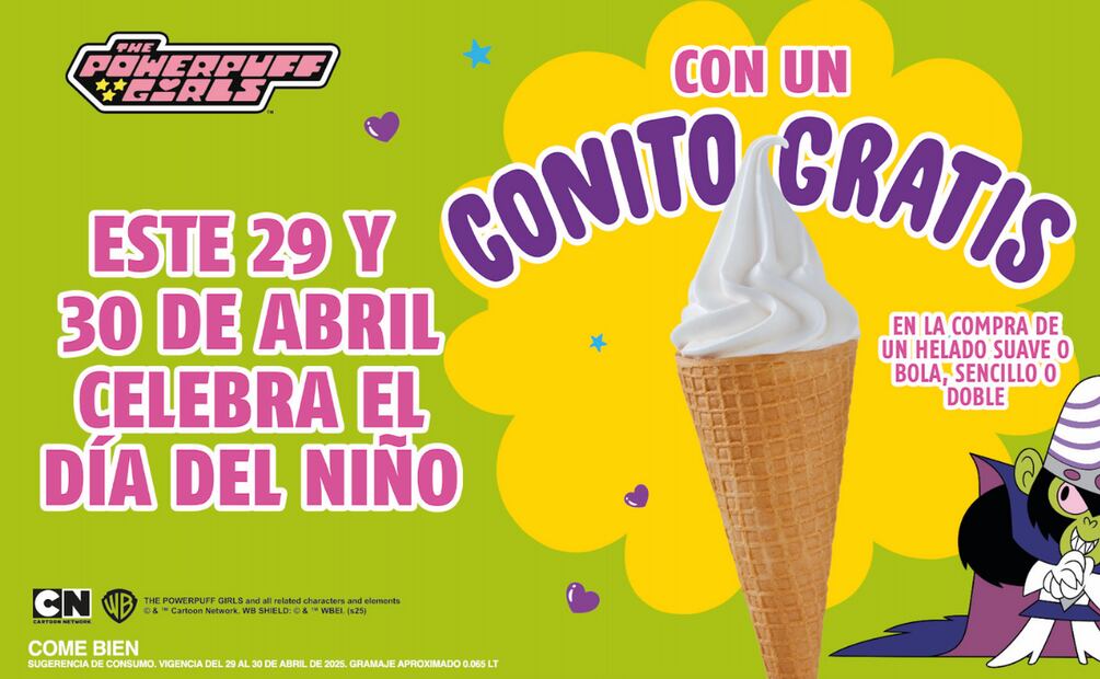 En la compra de cualquier helado suave o de bola, sencillo o doble, la promoción incluye: Un conito gratis de helado de yogurt.