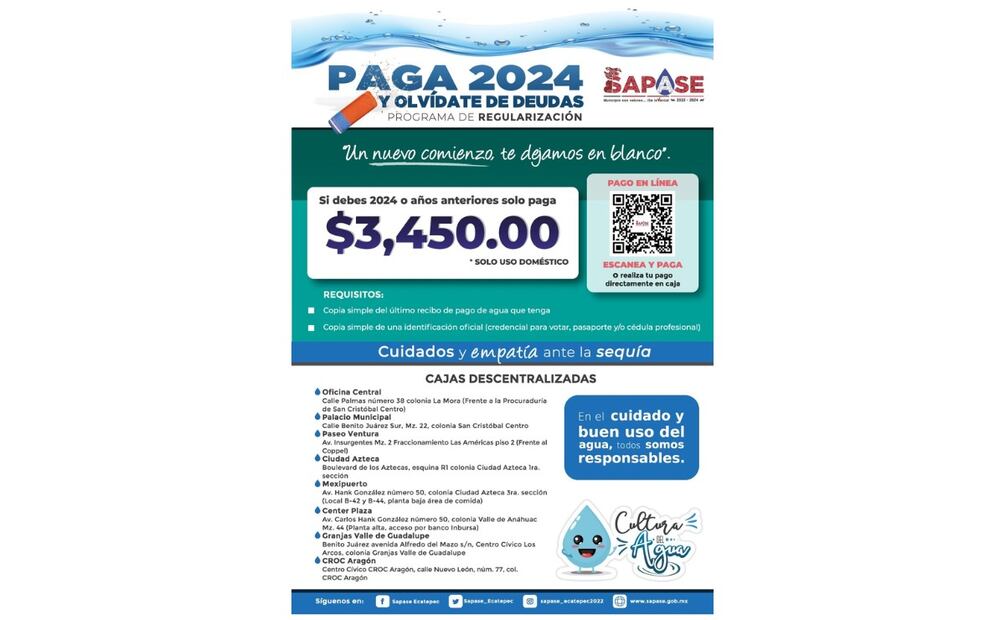 El Sistema de Agua Potable Alcantarillado y Saneamiento del Municipio de Ecatepec (SAPASE) ha lanzado un programa de regularización que permite a los residentes saldar sus deudas con importantes descuentos. La oferta principal es la posibilidad de pagar una cantidad fija de 3 mil 450 pesos en las cajas descentralizadas distribuidas por el municipio.
