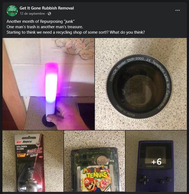 "Quizá deberíamos cambiar la descripción de nuestro negocio de 'remoción de escombros' a 'remoción de tesoros', se lee en otra de sus publicaciones donde se observa una laptop, unos palos de golf, un dron y varios juegos para la consola PlayStation 1.