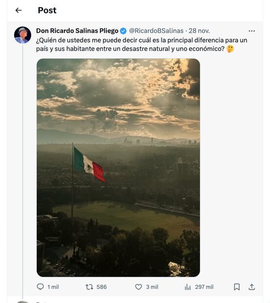 Ese post fue citado en la red social X por Salinas Pliego, quien declaró: "Está es la respuesta más alineada a la realidad, por más grande que sea un desastre natural es dificilísimo que lo sufra la población en todo el país (a menos que el país sea muy pequeño), el desastre económico lo sufre toda la población, además de que uno es de cierta forma impredecible y el otro provocado".